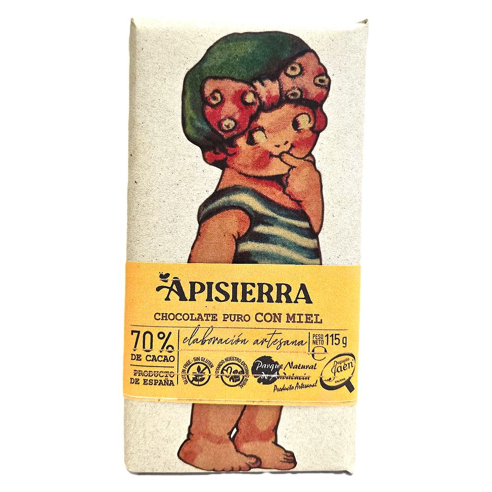 | Chocolate Puro con Miel 115 g Apisierra | Chocolate 70 % cacao + miel, sin gluten, artesano, sabor doble (cacao+miel) | Especial gift, degustación gourmet, tienda de autor | Regalo, café-momento, brunch dulce |